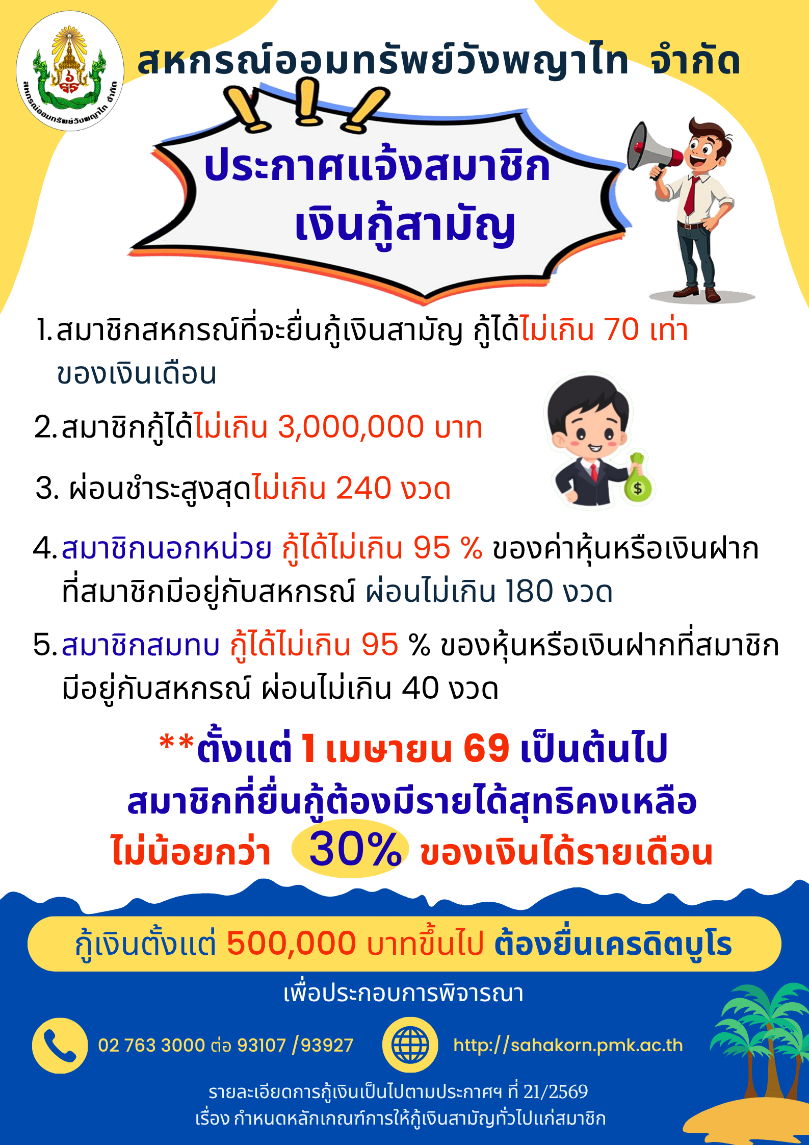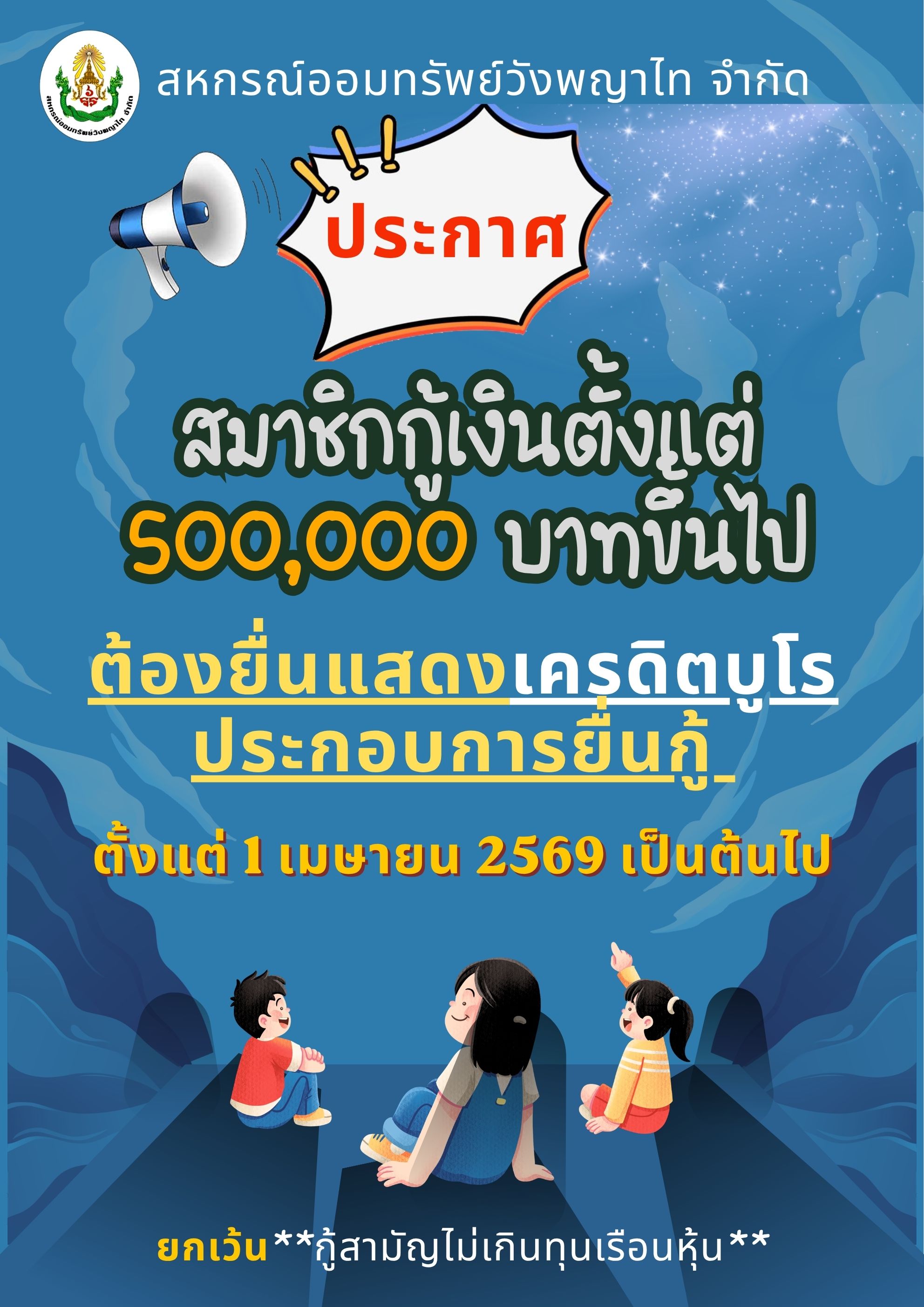 ประกาศ สหกรณ์ออมทรัพย์วังพญาไท จำกัด สมาชิกที่กู้เงินตั้งแต่ 500,000 บาทขึ้นไปต้องยื่นแสดงเครดิตบูโร