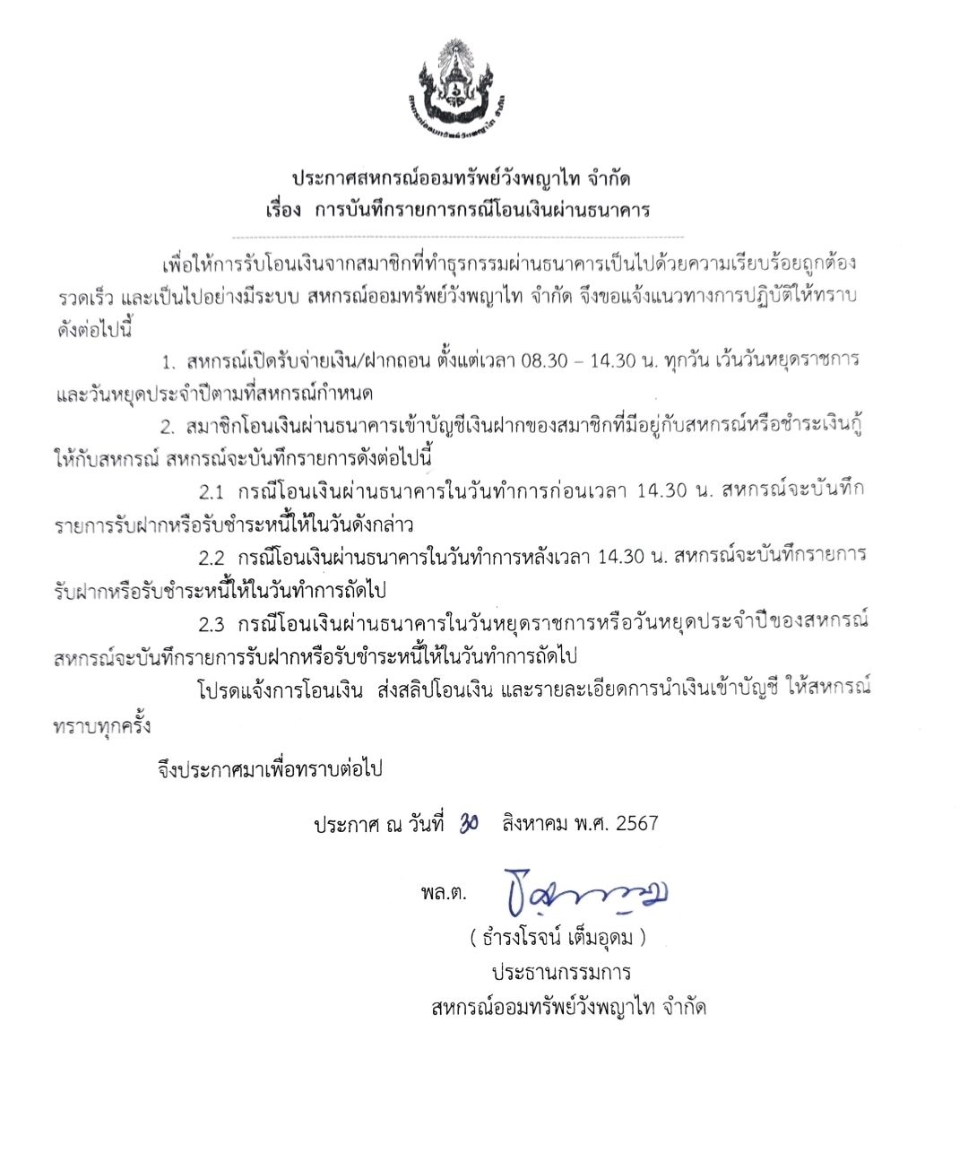 ประกาศแจ้งสมาชิกสหกรณ์..เรื่องการบันทึกการทำธุรกรรมโอนเงินผ่านบัญชี และการบันทึกบัญชี ให้สมาชิกแจ้งเมื่อมีการโอนเงินผ่านบัญชี